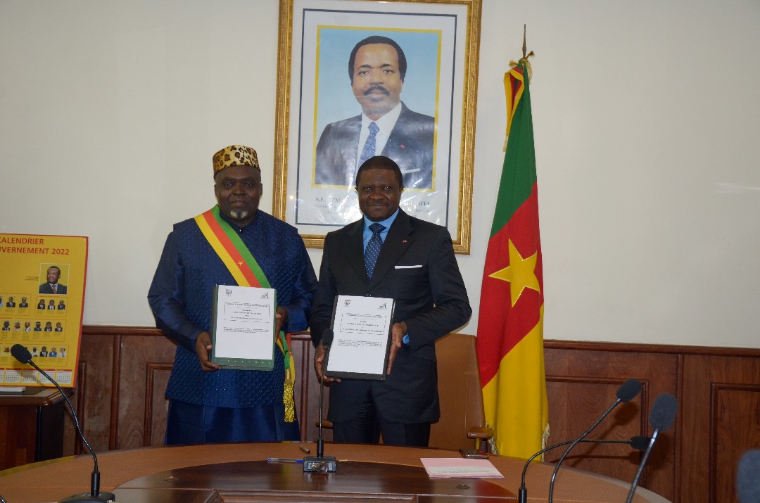 Le Ministre des Transports (MINT), Jean Ernest Masséna NGALLÈ BIBÉHÈ, a signé ce mercredi 03 juillet 2024 dans la salle de conférences du Département ministériel dont il a la charge, un Accord-cadre de collaboration, avec la Communauté Urbaine de Bafoussam, représenté par le Maire de ville de Bafoussam, Roger TAFAM.