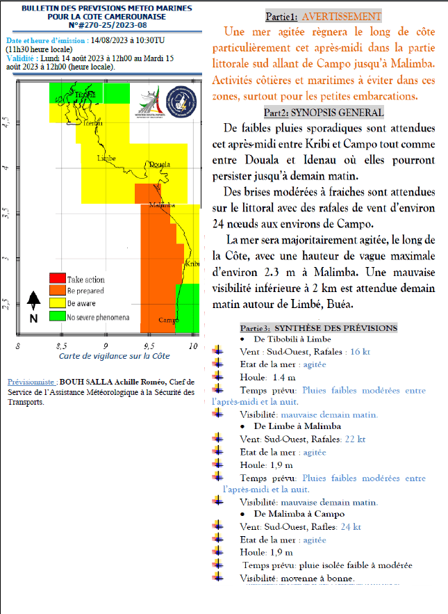 La Direction de la Météorologie Nationale, a émis des avis dans ses prévisions météo-marines quotidiennes des 12, 13, 14 et 15 août 2023. Il était annoncé une mer agitée le long de la côte, particulièrement dans la partie sud. La prévision spécifique du 14 août valide jusqu’au 15 août contenait un AVERTISSEMENT relatif à l’agitation de la mer avec des vagues supérieures à deux mètres. Il a même été déconseillé de mener les activités maritimes dans cette zone, surtout pour les petites embarcations.